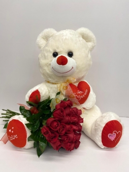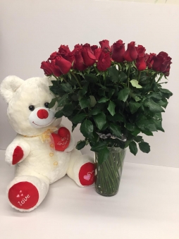 Peluş ayı vazoda kırmızı güller