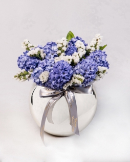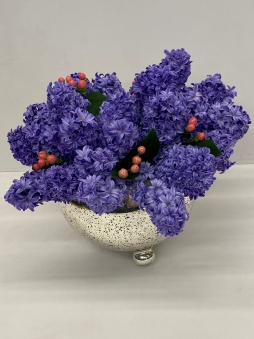 Gümüş kaplama vazoda mor sümbüller