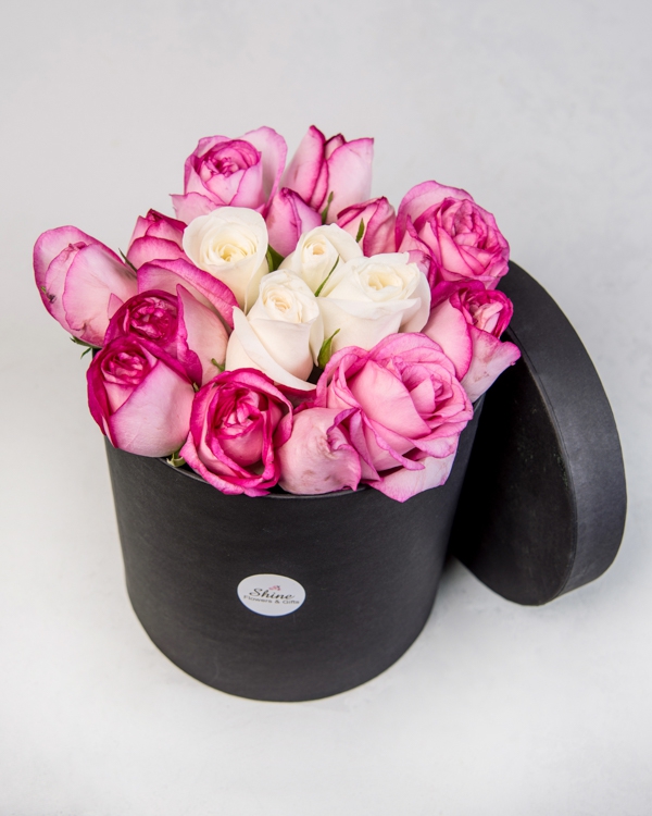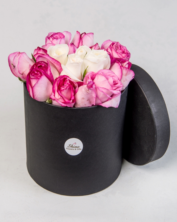 Siyah Silindir Kutuda Pembe ve Beyaz Güller